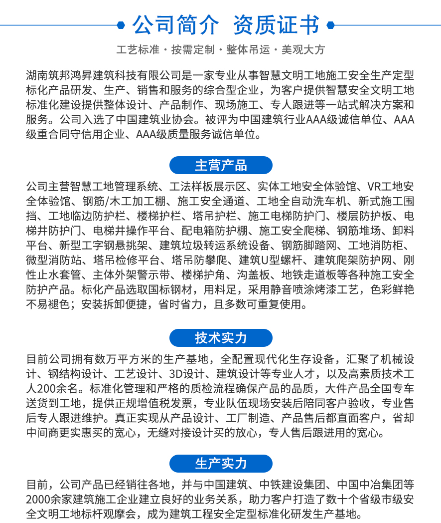 筑邦鴻昇工法質量樣板展示區主要包括主體結構樣板、砌體抹灰樣板、樓梯樣板、廚衛樣板、屋面樣板、電氣預埋樣板、給排水井樣板、水井電氣預埋樣板、幕墻石材干掛樣板、衛生間同層排水、基礎樣板、裝飾抹灰樣板、地下室樣板、獨立柱樣板等數十種樣板展示區。我們有著專業的建筑設計和施工團隊,地鐵施工樣板、市政施工樣板、路橋施工樣板等各類施工樣板,都可以根據客戶個性要求進行定制。