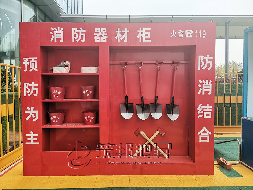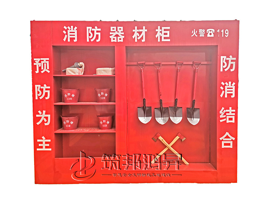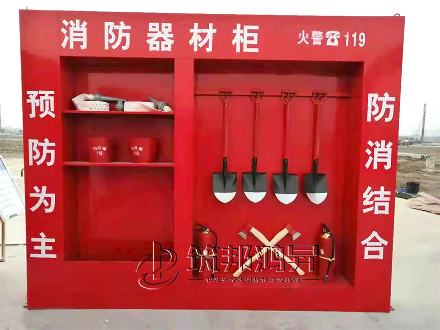 【筑邦鴻昇】工地消防器材柜采用整體焊接,高溫烤漆工藝不易褪色,顏色鮮艷,再搭配消防管、消防鏟、消防桶、 等消防斧配件。